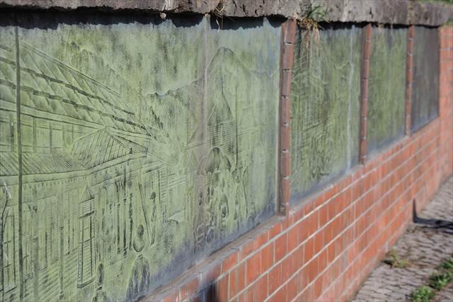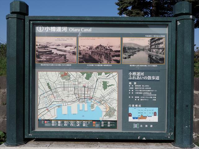 案内看板と小樽運河の歴史が刻み込まれたレリーフ。