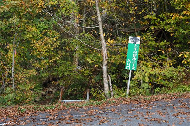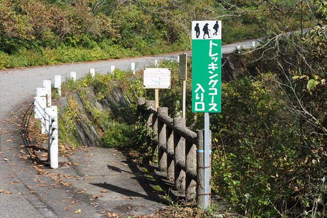 ヒュッテから道路を上がってすぐにトレッキングコース入り口の看板があります。