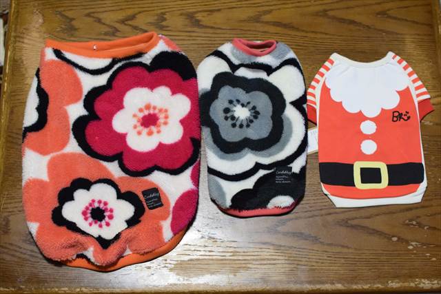 左から、でんすけ君用、なびちゃん用、オマケでなびちゃん用の既製品のサンタコスプレ服を購入。