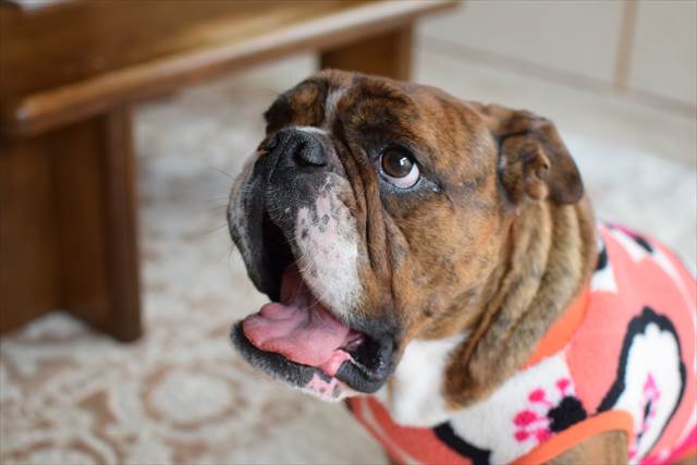 厚い脂肪で覆われているため、寒くならないと服を着る機会がないブルドッグ。